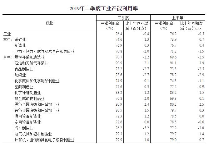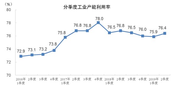 2019年二季度,全国工业产能利用率为76.4%,比上年同期下降0.4个百分点,比一季度上升0.5个百分点。上半年累计,全国工业产能利用率为76.2%,比上年同期下降0.5个百分点。