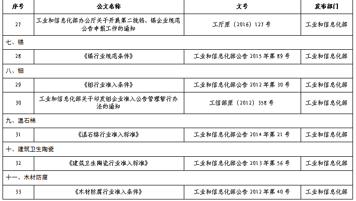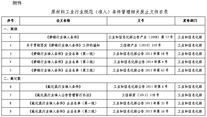 一、自公告发布之日起,我部印发的《黄磷行业准入条件》(工业和信息化部公告产业〔2008〕第17号)、《氟化氢行业准入条件》(工业和信息化部公告2011年第6号)等33个规范(准入)条件管理相关文件予以废止。