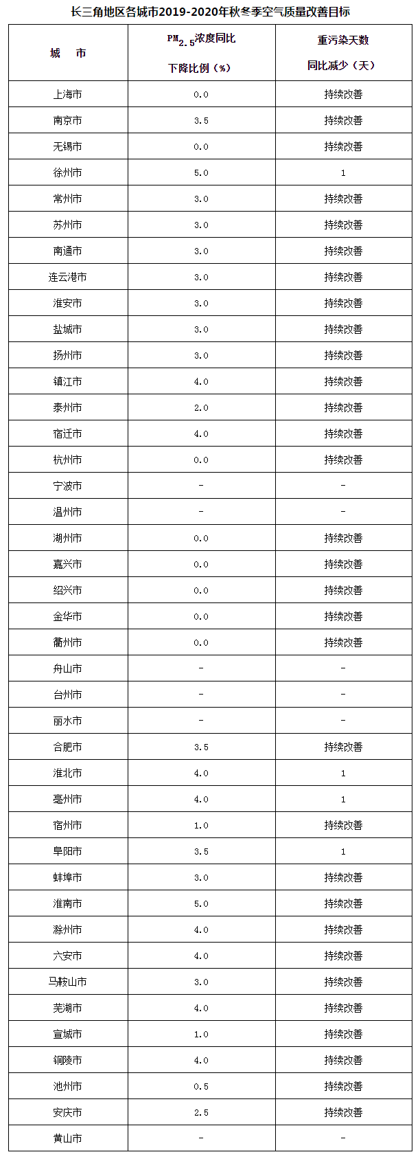 附件:1.长三角地区各城市2019-2020年秋冬季空气质量改善目标