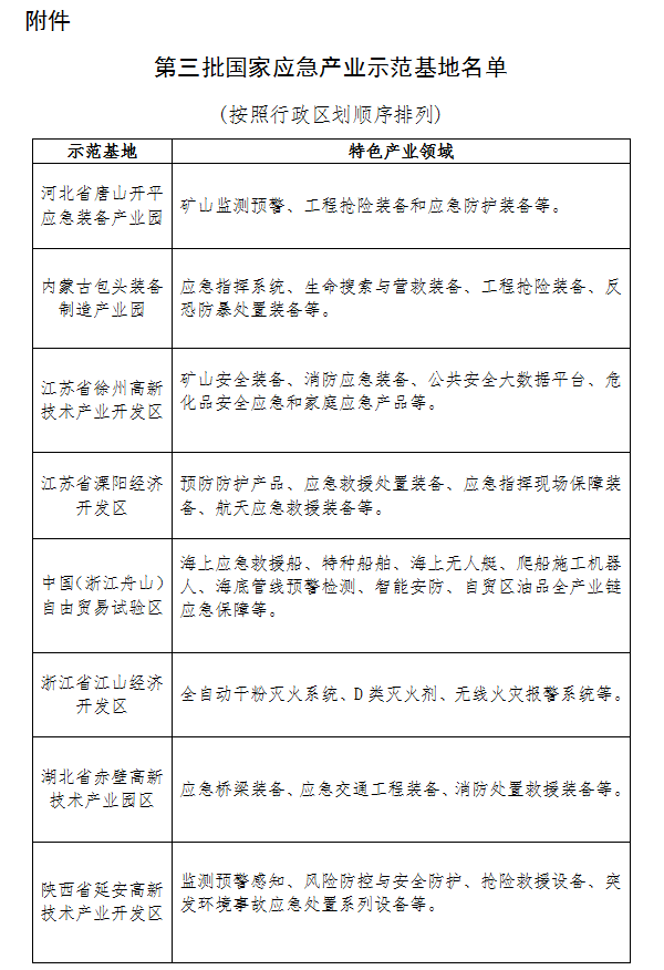 为贯彻落实《国务院办公厅关于加快应急产业发展的意见》(国办发〔2014〕63号),根据《国家应急产业示范基地管理办法(试行)》(工信部联运行〔2015〕227号)和《关于组织开展第三批国家应急产业示范基地申报工作的通知》(工信厅联运行函〔2019〕164号),经评审和公示,确定唐山开平应急装备产业园等8个应急产业集聚区为第三批国家应急产业示范基地(专业类)(具体名单见附件),现予以公布。有关事项通知如下: