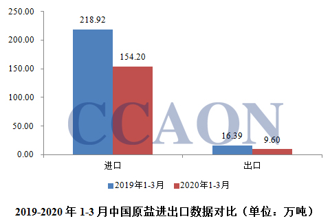 2020年一季度,中国原盐进口量总计154.20万吨,累计同比下滑29.56%。原盐出口量总计9.60万吨,累计同比下滑41.46%。