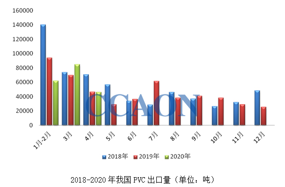 目前,国内PVC现货市场行情连续上调,主要由于国际油价大幅上扬,带动乙烯报价提升,对乙烯法PVC市场带来利好支撑以及下游塑料加工企业开工持续升高,使得华东、华南等集散地库存量下降等原因共同助推国内市场行情。根据中国海关数据显示,2020年4月,我国PVC纯粉出口量为4.58万吨,环比减少45.87%。目前,受国内PVC价格不断攀升、国外PVC外盘报价低位运行影响,国内PVC出口企业积极性减弱,多以内销为主。台塑公布6月PVC报价,整体来看,6月份较5月份PVC报价上涨30-40美元/吨。