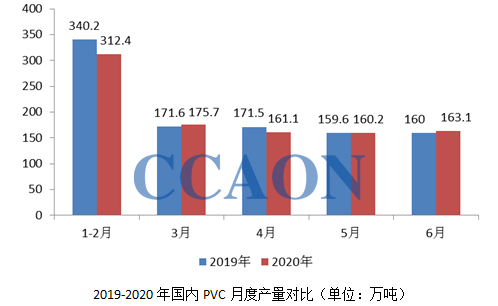 根据国统局最新发布数据,2020年6月当月,国内PVC产量为163.1万吨,与去年同期相比上涨2%;2020年1-6月,国内PVC累计产量968.8万吨,与去年同期相比下降3.2%。由于春季检修基本结束,国内PVC装置整体开工负荷有所提升,累计产量下降幅度较5月份收窄。