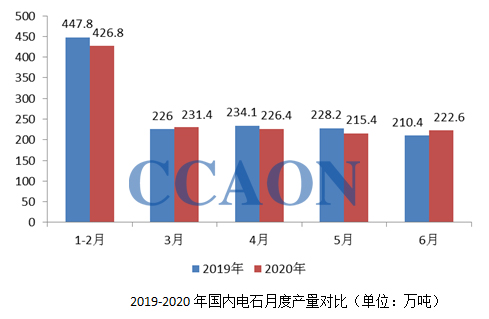 上游原料:2020年6月当月国内电石产量为222.6万吨,与去年同期相比上涨5.8%,2020年1-6月,国内电石累计产量1310.2万吨,与去年同期相比下降2.3%。6月份,国内电石装置开工出现明显的提升,单月产量增长较快,但由于前期开工不足,累计产量仍较去年同期有所降低。