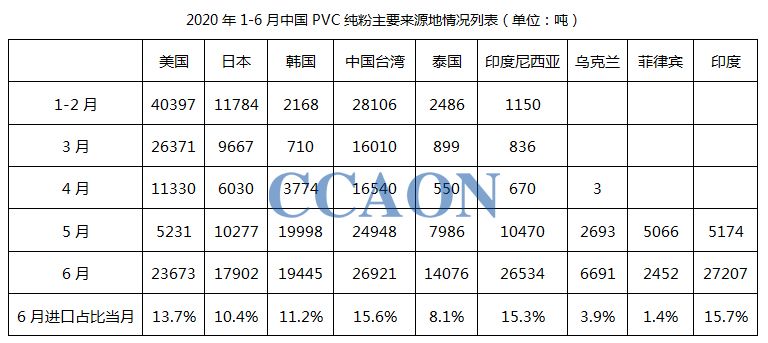 2020年1-6月中国PVC纯粉进口总量约45.2万吨,相比上年1-6月累计进口34.7万吨,同比增加30.3%;1-6月中国出口PVC纯粉约24.6万吨,相比上年1-6月累计出口27.5万吨,同比减少10.5%。总体来看,由于反倾销税率取消、中国国内需求恢复等多因素影响,美、日、韩、中国台湾地区相继增大了向中国的PVC出口,导致进口数量增长明显。