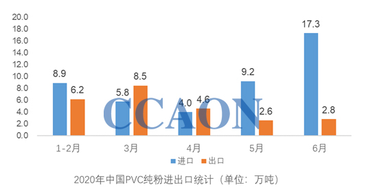 最新海关数据显示,2020年6月当月,我国PVC纯粉进口总量为17.3万吨,较5月进口量增加8.1万吨,环比增幅为88%,是继5月份中国PVC纯粉进口增长明显之后再次出现了大幅增加。此外,6月当月中国PVC纯粉出口数量为2.8万吨,和5月份相比变化不大,截至上半年看,出口贸易尚未有突破。