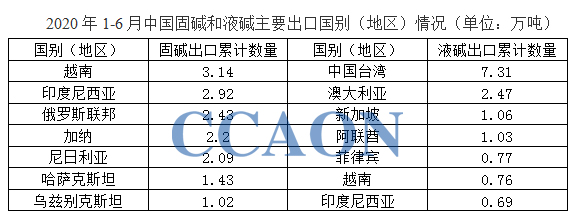 从出口国别上来看,2020年6月我国固碱出口量前三位的国家和地区分别为:俄罗斯0.57万吨,占比10.5%;越南0.54万吨,占比10%;加纳0.43万吨,占比8%。我国液碱出口量前三位的国家和地区分别为:中国台湾1.04万吨,占比42%;越南0.76万吨,占比31%;巴西0.62万吨,占比25%。