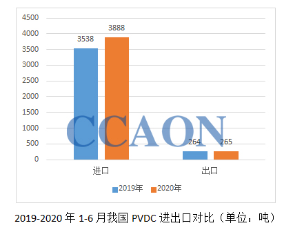 最新海关数据显示,2020上半年我国PVDC进口量为3888吨,同比增加10%;出口量为265吨,与去年同期的出口量264吨基本持平。