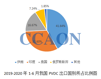 从出口国别来看,2020年上半年,我国PVDC主要出口前三国家分别是:伊朗110吨,占比41.64%;印度86吨,占比32.60%;泰国44吨,占比16.67%。