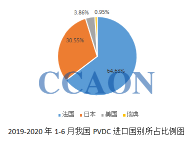 从进口国别来看,2020年上半年,我国PVDC主要进口前三国家分别是:法国2513吨,占比64.63%;日本1188吨,占比30.55%;美国150吨,占比3.86%。
