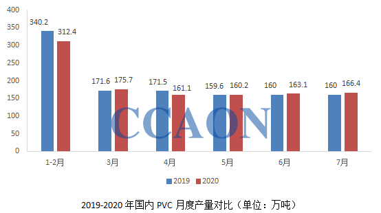 根据国统局最新发布数据,2020年7月当月,国内PVC产量为166.4万吨,与去年同期相比上涨4%;2020年1-7月,国内PVC累计产量1142.5万吨,与去年同期相比下降2.2%。7月份,随着检修工作陆续结束,国内氯碱装置整体开工负荷有所提升,单月产量出现一定的增长,但累计产量仍较去年有所下降。