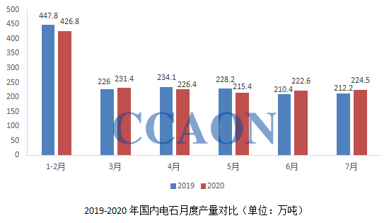 上游原料:2020年7月当月国内电石产量为224.5万吨,与去年同期相比上涨5.8%,2020年1-7月,国内电石累计产量1534.8万吨,与去年同期相比下降0.9%。7月份,随着国内电石行情的回暖,生产企业开工积极性较高,单月产量出现较为明显的提升。7月下旬,西北部分省份实施夏季限电措施,对电石产量的进一步提升造成制约。
