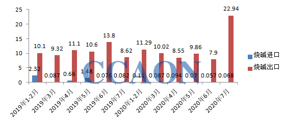 2020年7月,我国烧碱出口量为22.94万吨,同比大幅增加(2019年7月烧碱出口量为8.62万吨)。其中,固碱出口量为5.057万吨,同比减少15%;液碱出口量为17.88万吨,同比大幅上涨,2019年7月液碱出口量为2.64万吨。2020年1-7月,烧碱累计出口量为70.56万吨,同比增加11%;其中固碱累计出口量为36.4万吨,同比增长4.5%,液碱累计出口量为34.16万吨,同比增长18.6%。液碱出口数量的大幅上涨,主要是由于5月底6月初日本装置开工负荷低,货源相对紧张,国内部分液碱出口企业的签单增加所致。