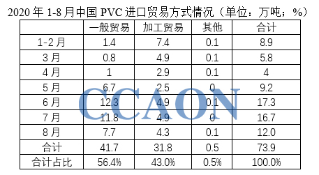 另外从进口贸易方式看,今年PVC一般贸易进口量较往年有明显提升,1-8月一般贸易进口41.7万吨,占比继续提高到56.4%。