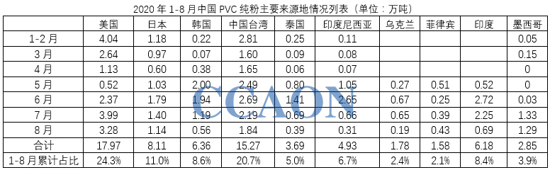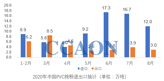 2020年1-8月中国PVC纯粉进口总量约73.9万吨,较去年同期累计进口量46.4万吨,增长59%;1-8月中国出口PVC纯粉约31.6万吨,相比上年1-8月累计出口37.5万吨,同比减少16%。