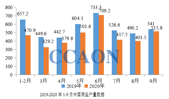 据国家统计局数据显示,2020年9月份中国原盐产量515.8万吨,同比增加22.5%;1-9月原盐产量3840.0万吨,累计同比减少0.8%。随着秋季扒盐面积扩大以及矿盐装置开工增加,原盐产量继续保持稳中增长。