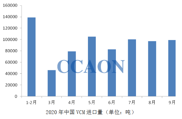 据中国海关最新数据显示,2020年9月,我国VCM进口量为9.91万吨,同比增长10.78%,环比增长1.88%;其中从日本进口4.62万吨,韩国进口2.82万吨,中国台湾进口1.79万吨,卡塔尔进口0.68万吨。2020年1-9月,VCM累计进口量为74.89万吨,累计进口量同比增加7.27%。进口均价为630.31美元/吨。2020年9月,我国VCM出口量为0.3万吨,以一般贸易方式去往越南。目前国内VCM需求旺盛,一般以内销为主。