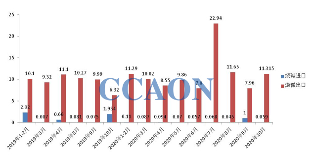2020年10月,我国烧碱出口量为11.315万吨,同比增长79%。其中,固碱出口量为3.385万吨,同比减少16.5%;液碱出口量为7.93万吨,同比大幅增长。2020年1-10月,烧碱累计出口量为101.5万吨,同比增长12.6%;其中固碱累计出口量为48.9万吨,同比减少2.2%,液碱累计出口量为52.6万吨,同比增长31%。
