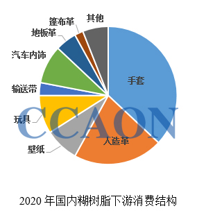 糊树脂作为PVC特种树脂中产量最大的品种,特别是在软制品方面的应用有其独特优势,同时还具有加工工艺简单,生产成本低,下游应用较为广泛等优势,因而受到行业内的广泛重视。我国聚氯乙烯糊状树脂主要用于制造浸渍手套、人造革、汽车内饰、玩具、壁纸、地板革、输送带、蓄电池隔板、水田靴等。其中,手套消费占比37%,人造革占比21%,汽车内饰和玩具分别占比9%。