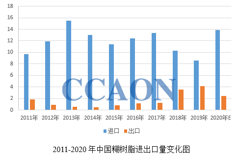 对外贸易方面,随着国内产品质量的提升和牌号的丰富,糊树脂对外依存度逐渐降低,近年来进口量逐年减少,出口量却有明的提升。但2020年受疫情的影响,中国成为第一批复工复产的国家,并且具有完整的产业链优势,导致进口量出现明显的增长,通过对1-10月份进口数据的分析,2020年国内糊树脂进口总量预计近14万吨。出口方面,国际上对糊树脂原料的需求减少,转而需要大量的终端手套制品,导致出口量有所降低,预计2020年国内糊树脂出口总量将在2.4万吨左右。