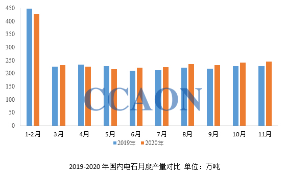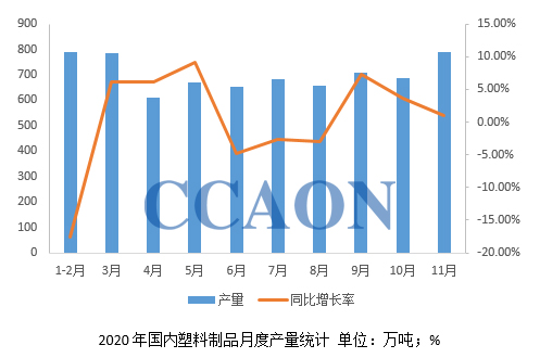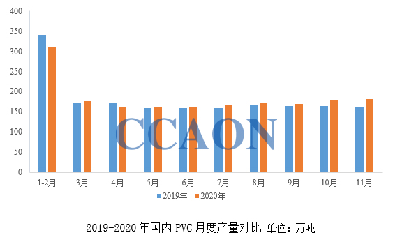 根据国统局最新发布数据,2020年11月,国内PVC产量为181.3万吨,与去年同期相比上涨11.9%;2020年1-11月,国内PVC累计产量1846.7万吨,与去年同期相比上涨1.1%。11月份,随着PVC企业检修陆续完成,加之沿海地区部分新装置投产,行业开工率提升,在原料、物流和需求多重利好的支撑下,国内PVC行情走势良好,单月产量出现较为明显的提升,累计产量也超过了去年的同期水平。