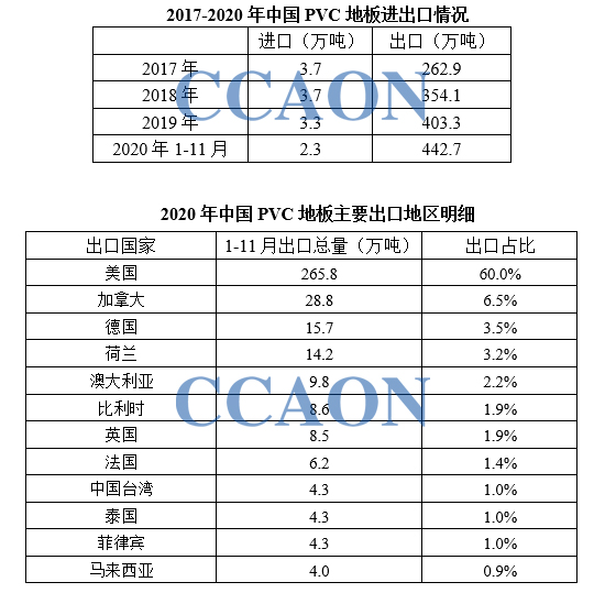 目前我国每年的PVC地板出口量占行业整体产量的比例约70%以上,最高可达80%,基本以外向型为主。2020年1-11月中国PVC地板出口累计442.7万吨,已超过2019年全年出口量。从数据看,基本没有受到疫情影响,但从行业企业的订单情况分析,仍存在很大的差异。比如去年上半年随着国外疫情的发展越来越严重,PVC地板生产企业中部分大工厂的订单虽然没有受到疫情影响,但规模较小的工厂,有陆续被国外买家取消订单以及让其停止出货等现象发生。