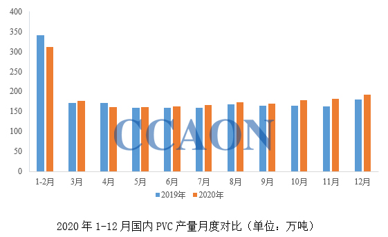 根据国统局最新发布数据,2020年12月,国内PVC产量为191.4万吨,与去年同期相比上涨6.0%;2020年国内PVC累计产量为2074万吨,与去年同期相比上涨3.3%(以上均为国统局当期公布数据)。12月份,随着PVC企业集中检修结束,行业整体开工负荷不断提升,加之烟台万华、青岛海湾二期新增乙烯法PVC装置产能逐步释放,市场货源供应逐渐宽松。全年来看,2020年净增产能146万吨,一季度,受公共卫生事件影响,下游企业复工有所延迟,PVC市场启动缓慢;二季度至四季度末,PVC市场开始从谷底反弹,行情整体向好,2020年全年产量有较明显的提升。