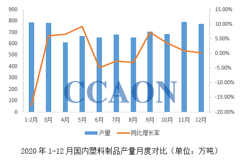 下游塑料制品:2020年12月,国内塑料制品产量774.8万吨,与去年同期相比增长0.3%;2020年国内塑料制品累计产量7603.2万吨,与去年同期相比增长-6.4%(以上均为国统局当期公布数据)。12月份,随着PVC行情上涨以及天气转冷,建筑等行业需求逐步减少,塑料制品企业生产负荷下降。全年来看,1-2月,受公共卫生事件影响较大,塑料制品企业复工延迟,6-8月,受天气炎热、南方梅雨等影响,建筑行业施工受限,塑料制品企业开工也受到一定制约,其他月份塑料制品的产量与去年同期相比均实现正增长,但总体来看,全年产量较上一年有所下降。