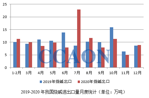 2020年12月,我国烧碱出口量为8.925万吨,同比增长3%。其中,固碱出口量为3.185万吨,同比减少30%;液碱出口量为5.74万吨,同比增长40%。2020年,烧碱出口累计达115.5万吨,与2019年114.7万吨相比增长0.6%。其中,液碱出口59.4万吨,较2019年同比增长5.9%;固碱出口56.1万吨,较2019年同比减少4.3%。