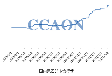 春节过后,在液氯和醋酸行情不断上行的支撑下,国内氯乙酸市场不断上行,各主流消费市场成交重心已达到近年的最高峰。进入3月份,河北、山东部分氯乙酸企业开工负荷降低,缓解了前期因下游观望而造成的库存压力,坚定了企业出货报盘的信心,推动氯乙酸行情再度上行。
