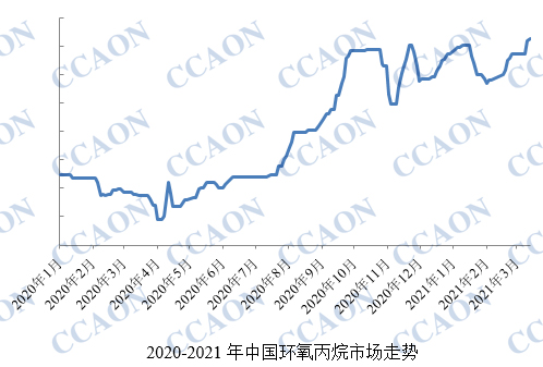 近期,北方取暖季即将结束,下游限产逐步放松,工厂开工稳中上升。作为氯醇法环氧丙烷工艺的原料之一液氯,自3月初以来,随着耗氯下游开工增加,市场采购持续增长,出厂价格呈现连续上调,对环氧丙烷市场形成利好支撑。美国拜登政府1.9万亿美元经济刺激计划签字实施,全球市场迎来经济通胀预期,大宗原料产品等避险情绪增加,市场攀升至近期高位。同时,美国还将计划实施包括大规模基建在内的经济复苏一揽子计划,其规模将超出当前刺激计划,后市通胀压力有增无减。加之环氧丙烷主要工厂近期停车检修,货源供应有一定缩量,内外形势共同作用下,贸易商囤货数量增加,市场触及近期新高。