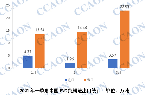 2021年1-3月,国内累计进口PVC纯粉量10.31万吨,较去年同期下降29.9%,1-3月份,国内累计出口PVC纯粉50.93万吨,与去年同期相比大幅增加247.9%。