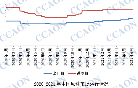 自5月份以来,国内海盐大面积产盐,工业盐供应总量增加。同时,下游两碱工厂检修激增,工业盐采购气氛有一定减弱,市场博弈气氛加重。进口市场,印度疫情防控形势依旧紧张,海运船只进境检查手续繁琐,国际船运租赁费用居高不下,带动进口盐市场持续高位。面对原盐内外盘较大差距的现实考虑下,两碱企业对进口盐市场采购趋于减少,内贸盐采购数量逐渐增加。随着原盐市场供需关系的细微转变,贸易商囤货惜售情绪增加,市场看涨预期增长。供需关系持续博弈下,6月上旬,山东下游两碱企业采购国内原盐价格上调25-40元/吨。