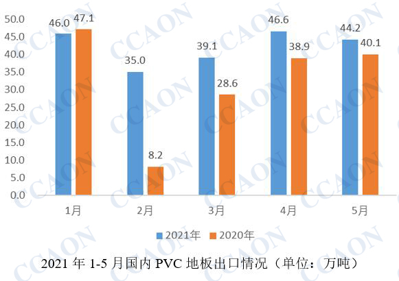 2021年1-5月中国PVC地板出口累计达到了210.9万吨,同比去年同期162.8万吨的出口量增加48.1万吨,增幅29.5%。