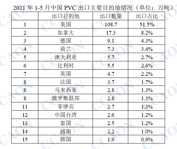 目前美国、加拿大、德国等国家和地区仍是进口中国PVC地板的主要客户, 1-5月,其中,中国出口至美国的PVC地板占比达到了51.5%,其次为加拿大和德国,占比分别为8.2%、4.3%。今年以来,PVC下游如地板行业订单情况基本良好,对原料需求也形成了刚性支撑。