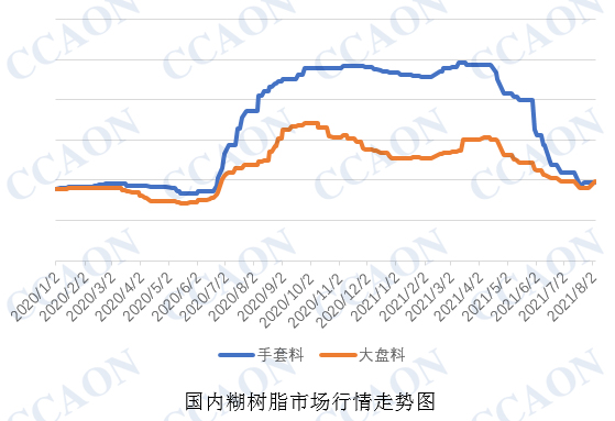 5月下旬以来,由于下游制品企业外贸订单骤减,且国内需求持续低迷,糊树脂市场震荡探底,接着行情的不断下探刺激了下游的备货,行情在7月末出现小幅回暖,但整体交投区间已较前期出现明显的下调。