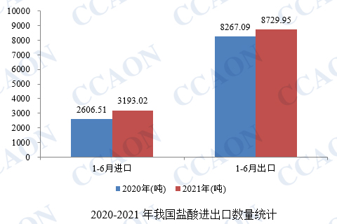据最新海关数据显示,2021年6月,我国盐酸进口515.07吨,同比减少8.3%;出口1092.71吨,同比增加39.4%。1-6月我国盐酸进口3193.02吨,累计增加22.5%;出口8729.95吨,累计增加5.6%。
