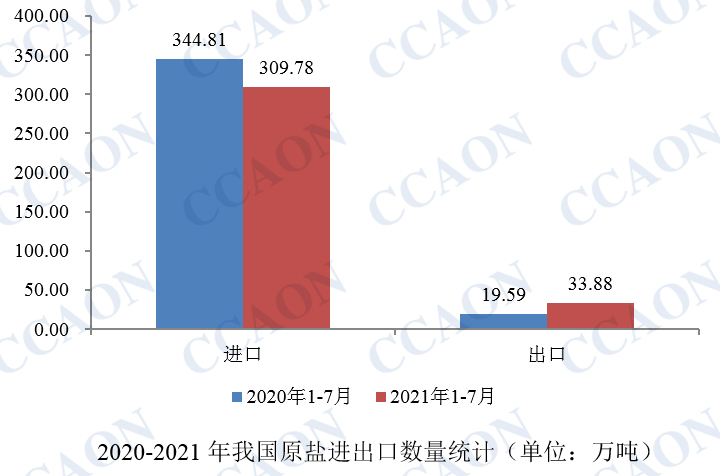 据最新海关数据显示,2021年7月我国进口原盐15.72万吨,同比下降70.29%;出口3.97万吨,同比增加57.67%。1-7月我国原盐累计进口309.79万吨,同比减少10.16%;原盐累计出口33.88万吨,同比增加72.94%。