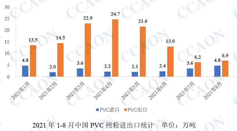 2021年1-8月,我国累计进口PVC纯粉量25.4万吨,较去年同期下降65.6%,1-8月份,国内累计出口PVC纯粉123.4万吨,与去年同期相比增加290.5%。