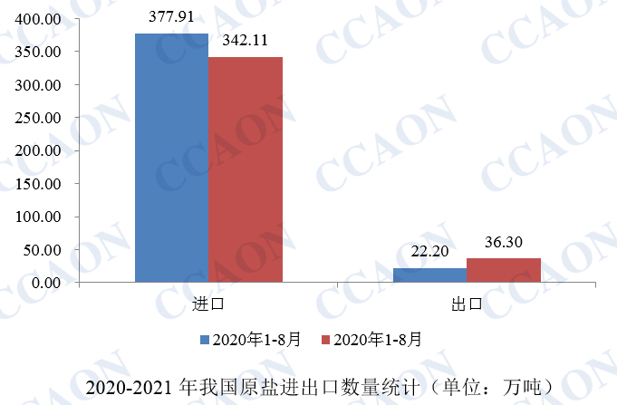据最新海关数据显示,2021年8月,我国进口原盐32.32万吨,同比减少2.34%;出口2.42万吨,同比减少7.10%。1-8月,我国原盐累计进口342.11万吨,同比减少9.47%;原盐累计出口36.30万吨,同比增加63.54%。