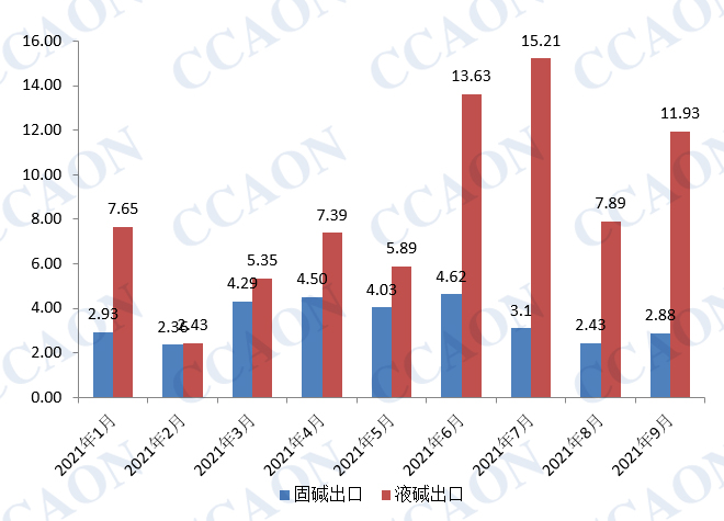 2021年9月,我国烧碱出口量为14.81万吨;其中,固碱出口量为2.88万吨,液碱出口量为11.93万吨。2021年1-9月,我国烧碱累计出口量为108.51万吨,较去年同期累计出口量90.17万吨增长20%;其中固碱累计出口量为31.14万吨,较去年同期下降32%,液碱累计出口量为77.37万吨,较去年同期上涨73%。