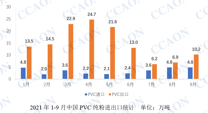 2021年1-9月,我国累计进口PVC纯粉量30.3万吨,较去年同期下降62.95%,1-9月份,国内累计出口PVC纯粉133.56万吨,与去年同期相比增加283.11%。