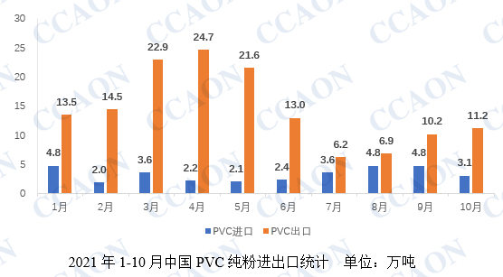 2021年1-10月,我国累计进口PVC纯粉量33.3万吨,较去年同期下降61.6%,1-10月份,国内累计出口PVC纯粉144.8万吨,与去年同期相比增加225.4%。