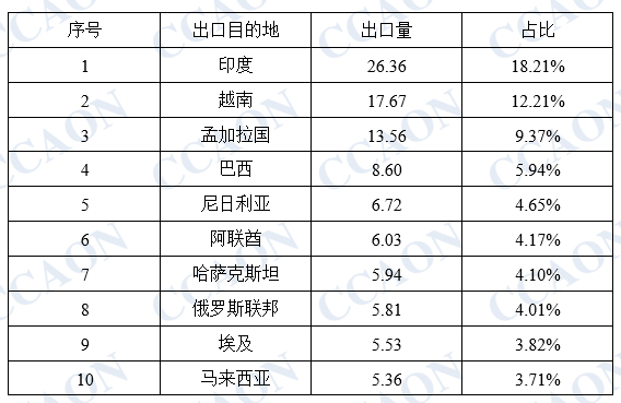 从出口目的地统计,印度仍是中国PVC纯粉出口的主要目的地,1-10月份,中国出口至印度的PVC纯粉达到26.36万吨,占中国出口总量的18%;出口至越南的PVC纯粉17.67万吨,占中国出口总量的12.21%;出口至孟加拉的PVC纯粉13.56万吨,占中国出口总量的9.37%。