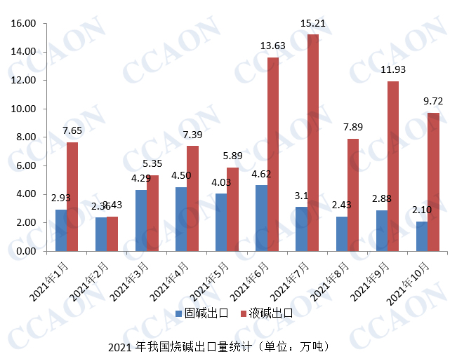 2021年10月,我国烧碱出口量为11.82万吨;其中,固碱出口量为2.1万吨,液碱出口量为9.72万吨。2021年1-10月,我国烧碱累计出口量为120.3万吨,较去年同期累计出口量101.5万吨增长18.5%;其中固碱累计出口量为33.2万吨,较去年同期下降32%,液碱累计出口量为87.1万吨,较去年同期上涨66%。
