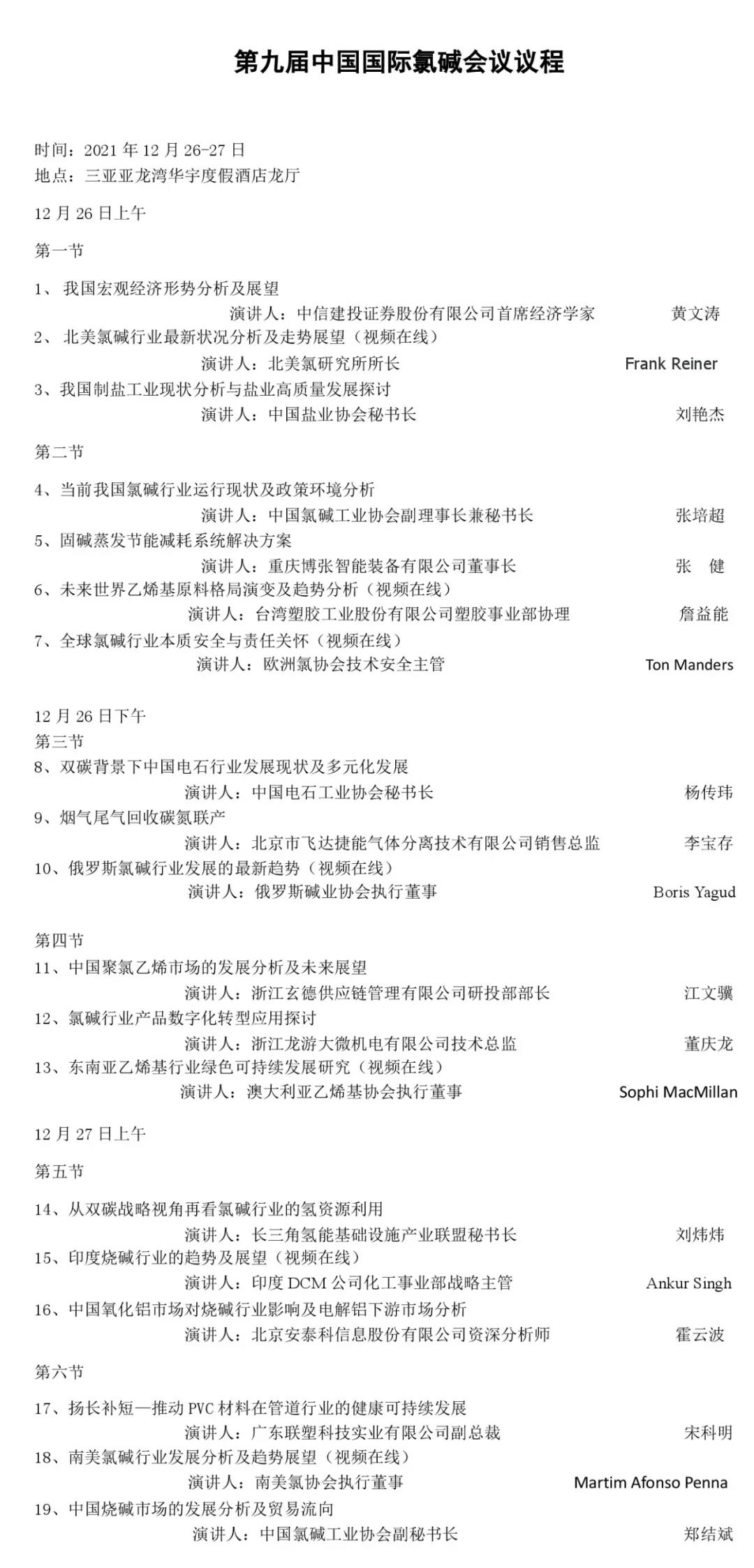 鉴于当前国内疫情的发展态势,特别是近日北京和上海突发疫情,经研究,并与三亚市商务局、卫健委和会议酒店协商后,为确保给所有会议代表提供安全的出行和会议环境,现决定将第九届中国国际氯碱会议推迟到2021年12月25-27日召开,25日报到,26日全天和27日上午会议,其他会议相关事项均不变。