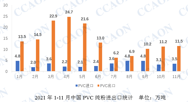 2021年1-11月,我国累计进口PVC纯粉量36.8万吨,较去年同期93.6万吨下降60.7%,1-11月份,国内累计出口PVC纯粉156.2万吨,与去年同期55.2万吨相比增加182.9%。