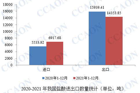 据最新海关数据显示,2021年12月,我国进口盐酸657.52吨,同比增加19.6%;出口1061.89吨,同比减少27.7%。1-12月,我国盐酸进口6917.68吨,累计增加25.0%;盐酸出口14353.85吨,累计减少9.9%。