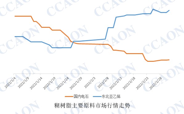原料市场,由于西北地区限电限产的力度不足,电石企业开工负荷保持在较高水平,节后基本延续了1月份的下行走势,对糊树脂的支撑力度减弱;而受到国际原油价格持续上涨的支撑,东北亚乙烯行情连续走高,乙烯法企业成本压力增大。