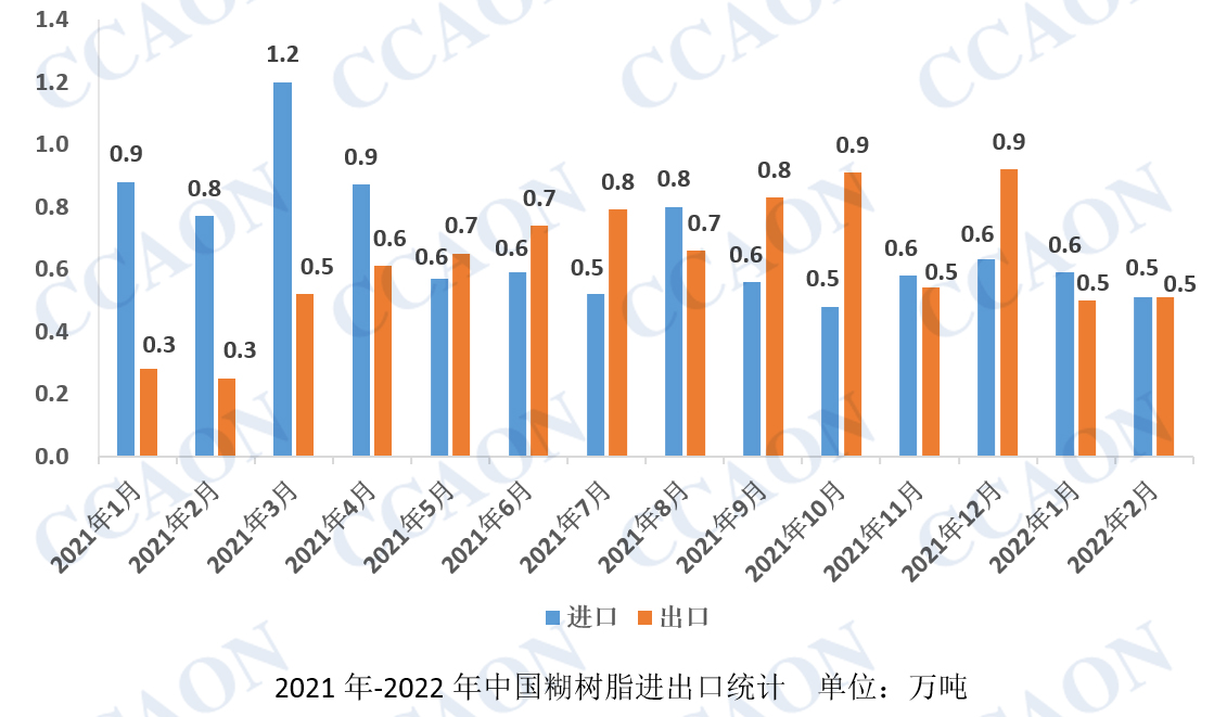 据最新海关数据显示,2022年1月我国糊树脂进口量为0.59万吨,同比去年减少32.2%;1月糊树脂出口量为0.50万吨,同比去年增加74.8%。2月我国糊树脂进口量为0.51万吨,同比去年减少33.9%;2月糊树脂出口量为0.51万吨,同比去年大幅增长103.2%。